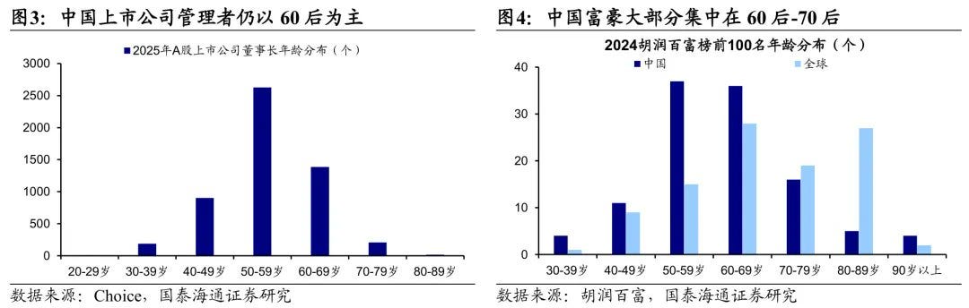 中国的50岁以上群体不仅财富总值高,而且储蓄高、负债极低。多项统计显示,中国的老年人群体储蓄率超过60%,住房负债率仅为5.9%。这让他们的资产负债表异常健康,财富质量高。这还只是看全社会的宏观情况。聚焦到富豪群体,胡润百富榜2025年的平均年龄是60岁,上市公司高管中,60后也是主力。中国的六零后赶上了外贸红利、房改红利、资本市场红利、创业红利,说他们是中国的财富主力应该没有争议。