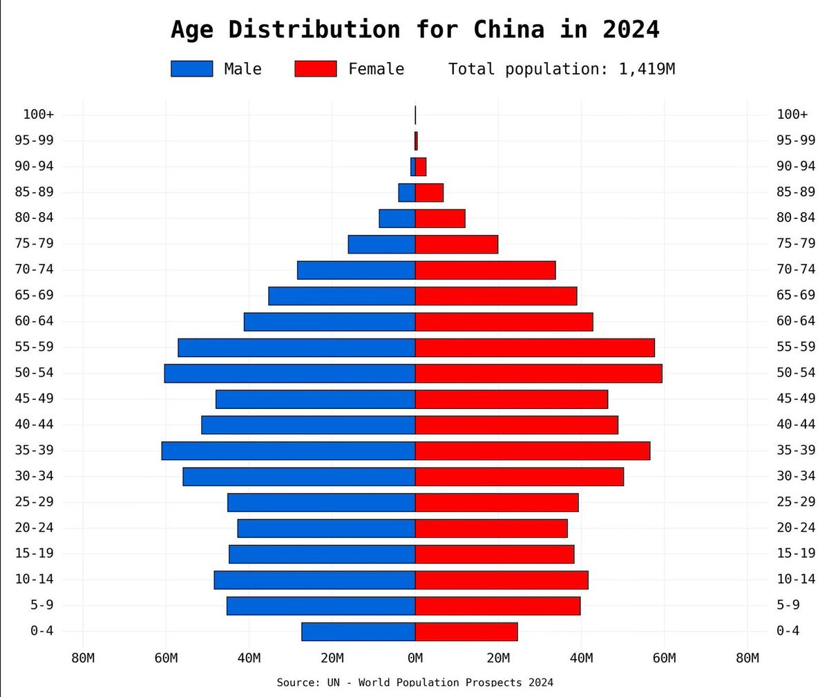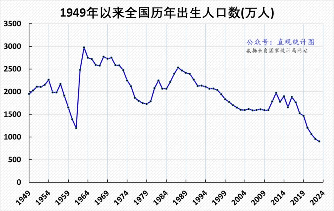 看看中国的人口结构,中国每年的新生儿数量已经跌回乾隆年间的700万人一年水平。未来,中国的主力人口将不是年轻人,而是老年人。50-60岁群体是目前中国人口金字塔中最庞大的年龄序列,大约有2.3亿人。这批人正好成长在大跃进后、计划生育成为国策以前的中国。他们的父母正是响应了毛泽东“人多力量大”号召的一代人。中国出生人口在大跃进后迅速攀升,1963年有3000万人出生,达到历史巅峰,并且连续十年维持在2500万人一年的水平,是中国的婴儿潮。